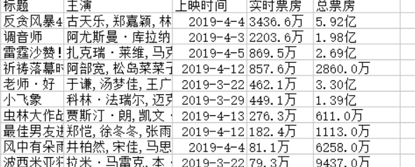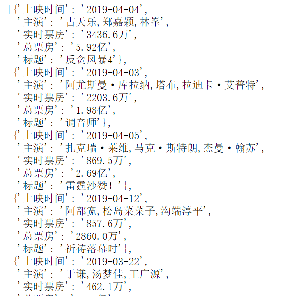 info.append({"标题":title,"主演":star,"上映时间":time,"实时票房":realticket,"总票房":totalticket})
