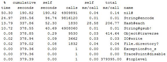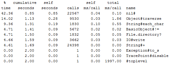 profile.rb是为ruby程序准备的profiler,它可以统计并输出各方法的运行时间,以便于找到程序执行的性能瓶颈。这次就用它来剖析脚本的运行时间。使用方法很简单,加上命令行选项-r profile就可以: