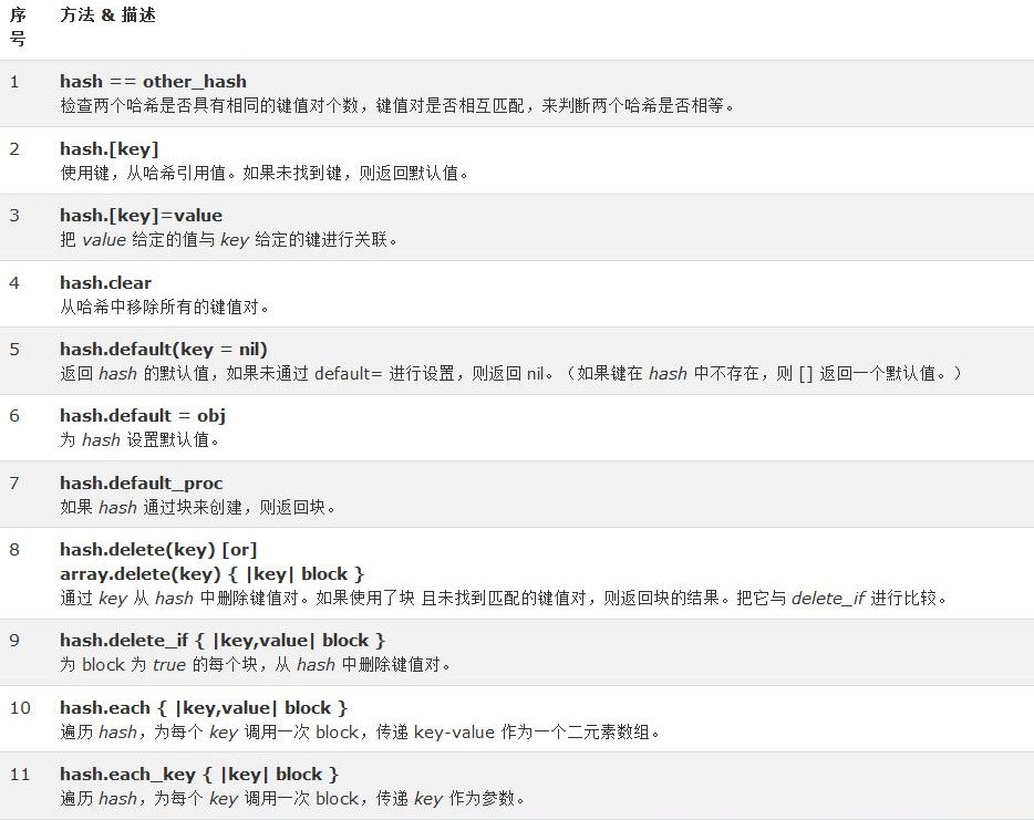 通过键或值遍历哈希的顺序看起来是随意的,且通常不是按照插入顺序。如果您尝试通过一个不存在的键访问哈希,则方法会返回 nil。