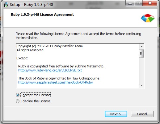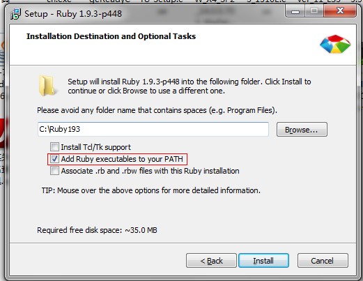 在安装的时候,请勾选add ruby executables to your path这个选项,添加环境变量,不然以后使用编译软件的时候会提示找不到ruby环境