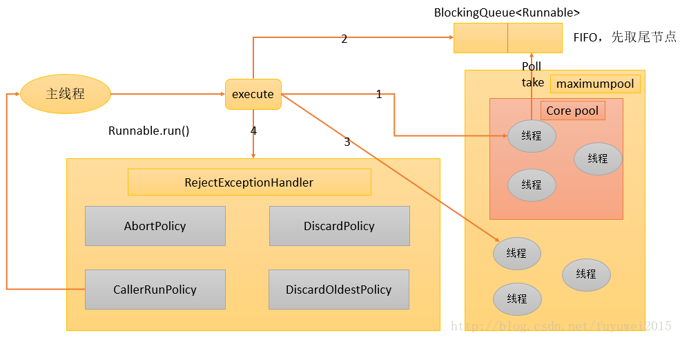 4、如果创建新线程将使当前运行的线程超出maximumPoolSize,任务将被拒绝,并调用RejectedExecutionHandler.rejectedExecution()方法。