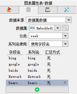 新建工作簿,添加内置数据集embedded1,每个星期几的各个搜索引擎的流量,如下图: