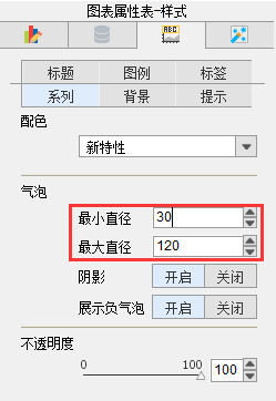 选中图表,点击图表属性表>样式>系列,气泡的最小直径、最大直径分别为30和120,如下图: