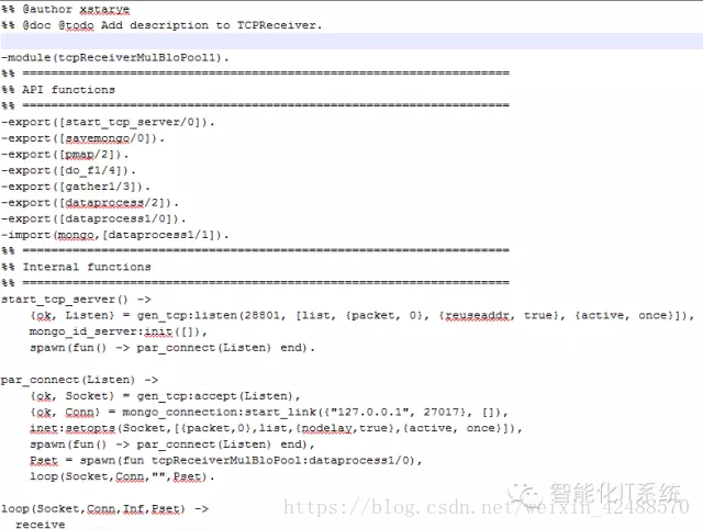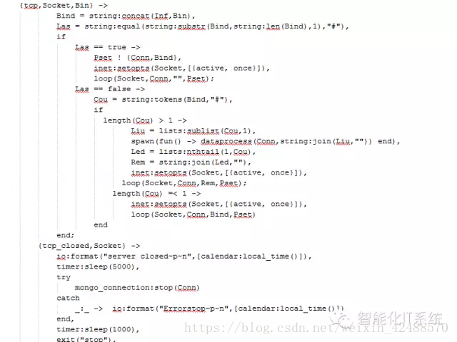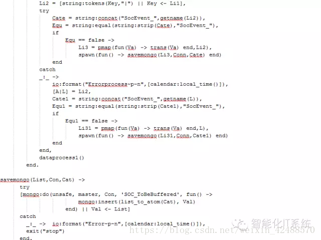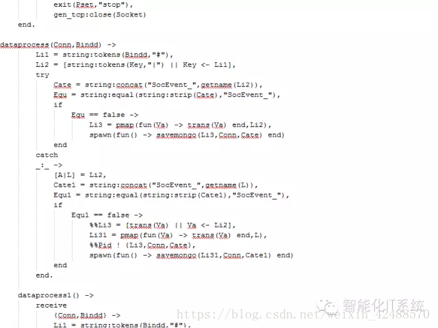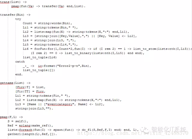 该案例中没有用erlang otp来开发,所以算是最原始的代码,现在把主要的逻辑实现的代码分享如下,因为时间急迫,注释没有加,感兴趣的可以通过扫描文章下方的二维码关注公众号:智能化it系统,进一步的沟通了解。最终,在笔记本电脑上测试,每天处理的数据量可以达到10亿,笔记本的配置是4核,主频2.5,内存4g,大家可以按照案例的业务场景自己来测试。