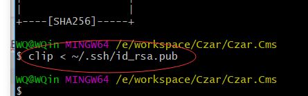 4.将生成的ssh key拷贝到剪贴板,执行 clip < ~/.ssh/id_rsa.pub (或者到上图提示的路径里去打开文件并复制):