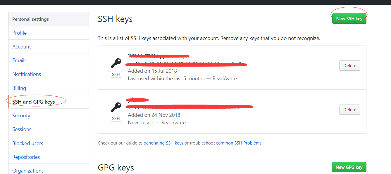 6.点击左边的SSH and GPG keys 然后在右边点击 New SSH key