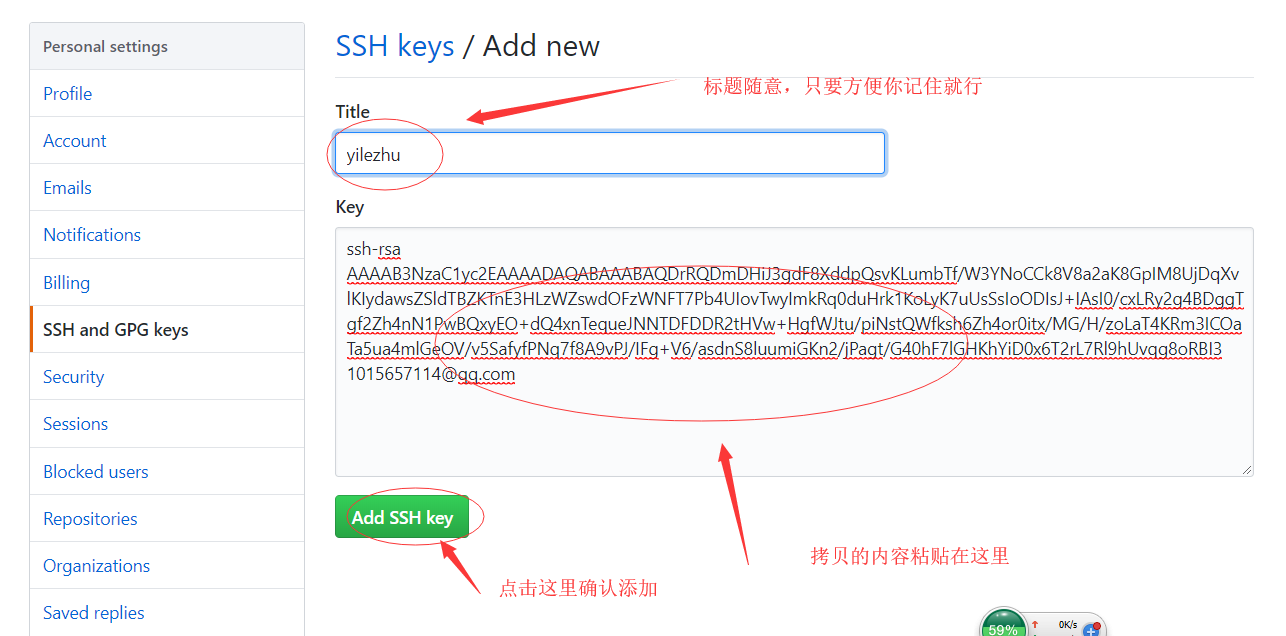 将ssh key粘贴到右边的Key里面。Title随便命名即可。这时候GitHub会给你发送一封邮件