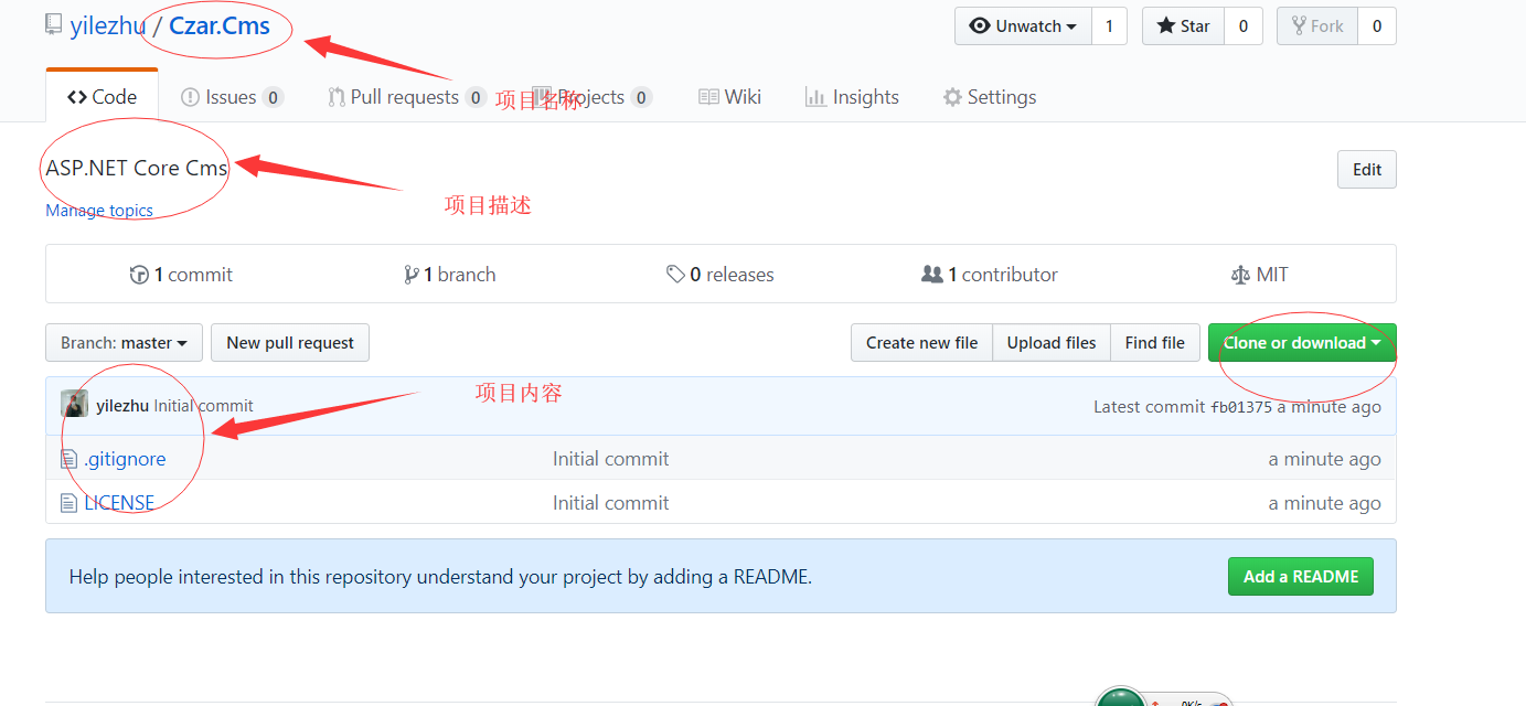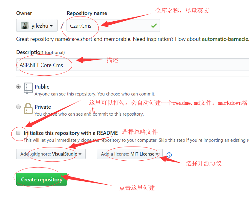 8.GitHub上创建一个新的项目,项目名称为Czar.Cms,这个仓库将作为我们后面CMS系统的GitHub上的远程仓库
