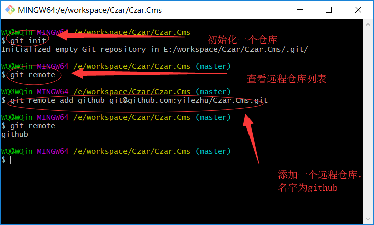 11.然后输入git remote 查看下远程仓库,正常的话应该有0个,现在就让我们添加下我们刚才建立的GitHub上的远程仓库吧.然后再看下远程仓库列表,发现已经有一个了,名字为github