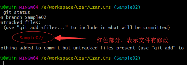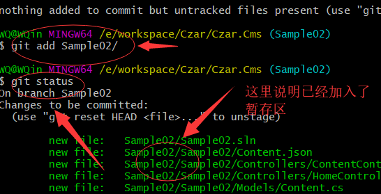 - git add Sample02/ :把Sample02文件夹下面的所有修改文件添加到暂存区