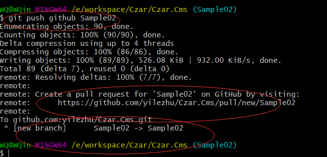 6.输入如下命令git push github Sample02把我们的本地代码提交到远程仓库的'Sample02分支'吧