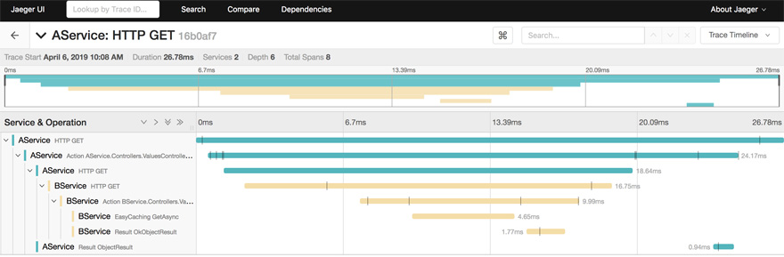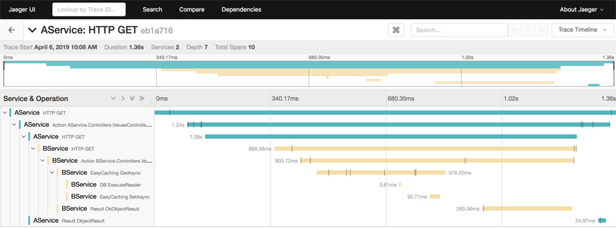 从上面这个图大概也能看出来,做了一些什么操作,请求来到AService,它就发起了HTTP请求到BService,BService则是先通过EasyCaching去取缓存,显然缓存中没数据,它就去读数据库了。