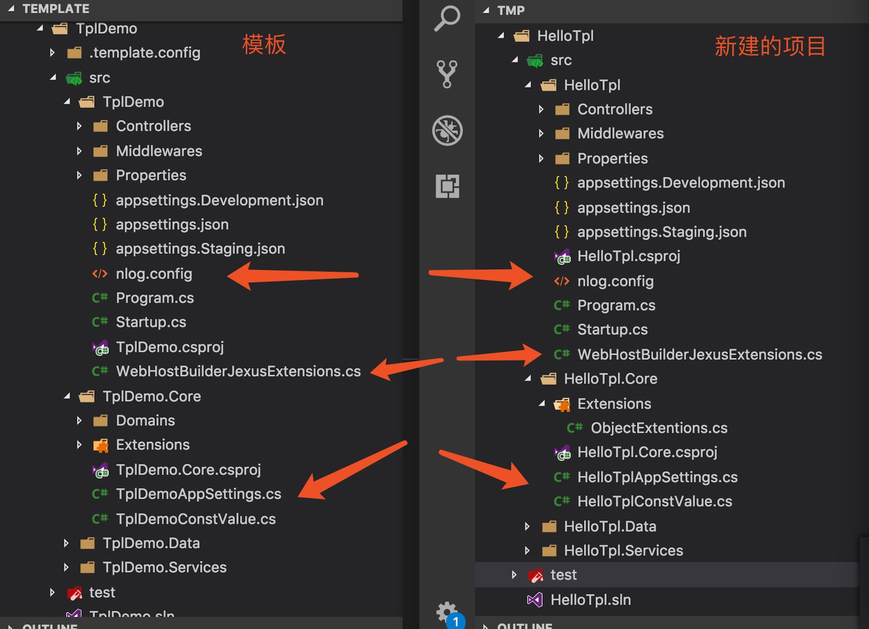 下面来看看,新建的这个HelloTpl这个项目的目录结构和我们的模板是否一样。