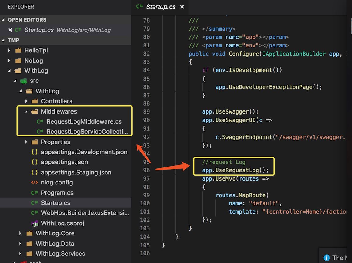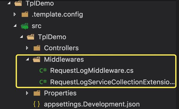 模板项目中有一个RequestLogMiddleware,就用它来做例子。
