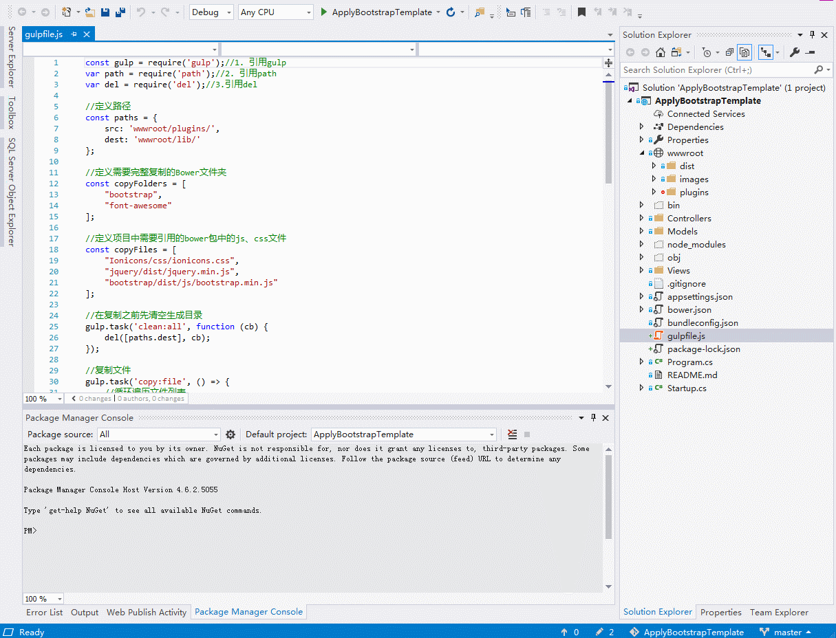 代码注释的很详细,就不过多赘述了。有一点需要解释下,为什么需要完整拷贝bootstrap和font-awesome呢?因为引用的font-awesome.min.css会引用包文件的一些字体文件等,为了省事,就把包全部拷贝了一遍。而一般绝大多数包都是简单拷贝css和js文件就ok了的。而至于什么时候拷贝文件,什么时候文件夹。很简单,默认先拷贝文件,运行项目,然后浏览器F12,如果发现有无法加载的error,那就是了。