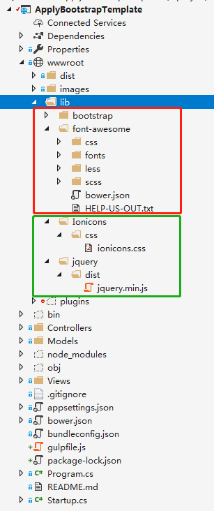 运行后,需要复制的Bower包文件和文件夹就会复制到wwwroot\lib文件夹下。如图: