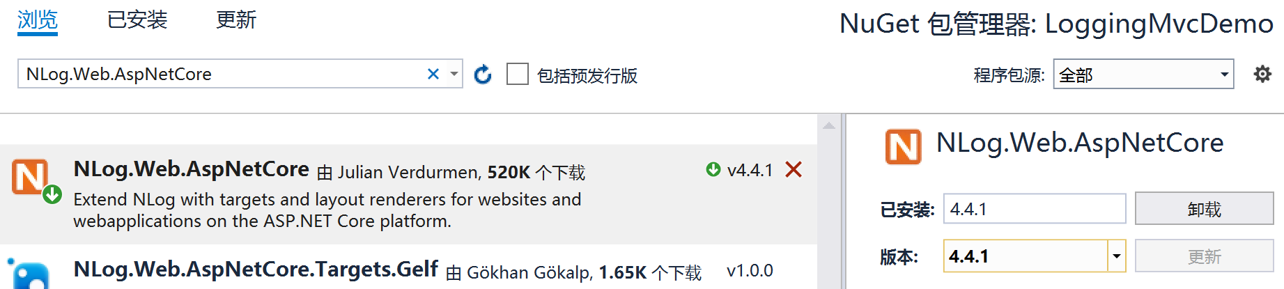 Nuget 安装 NLog.Web.AspNetCore(目前 Nuget 最新为 4.4.1,但是官方的教程却是 4.5 的,小编使用 4.4.1 进行演示)。如需 4.5+ 可参考官方:https://github.com/NLog/NLog.Web/wiki/Getting-started-with-ASP.NET-Core-2