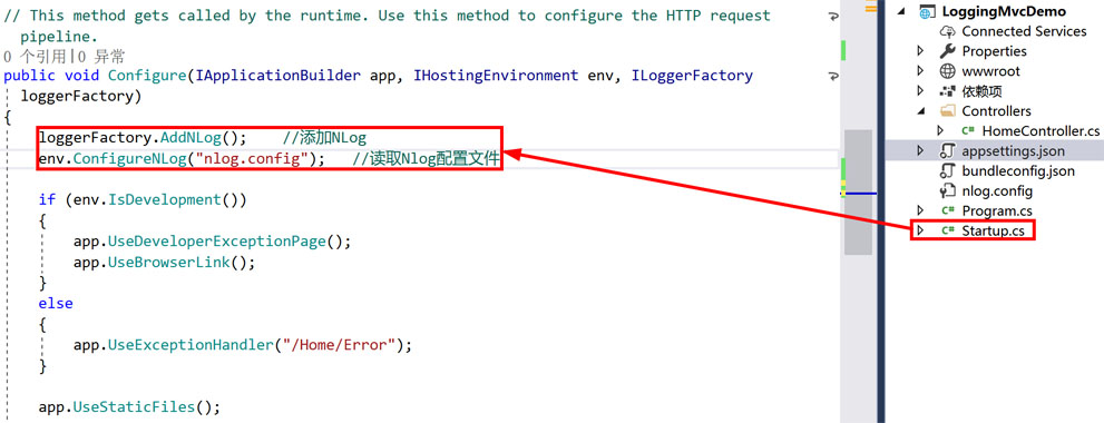 env.ConfigureNLog("nlog.config"); //读取Nlog配置文件