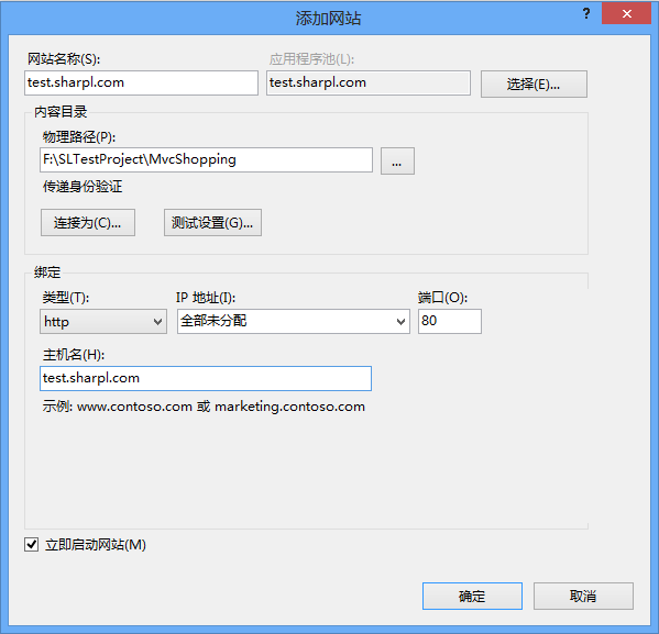 修改 “网站名称”、“物理路径”和“主机名”,如上图,网站名称和主机名称一致,且和步骤一的URL一致,物理路径为项目的文件路径。点击确定。