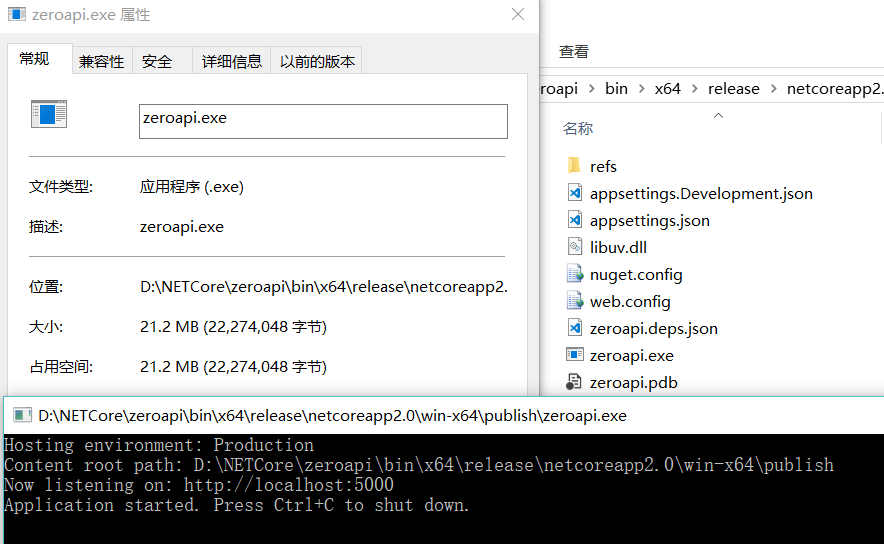 发布完成后,打开bin\x64\release\netcoreapp2.0\win-x64\publish 文件夹,里面zeroapi.exe即为最终文件,执行即可。
