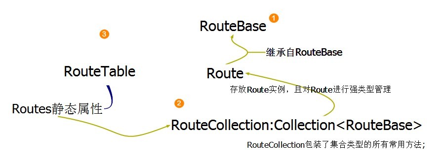 RouteTable:用来存放RouteCollection对象,路由表中有一系列的路由对象,而这一系列的对象就是RouteCollection管理的;在RouteTable中用Routes静态属性表示当前系统全局的路由映射表;