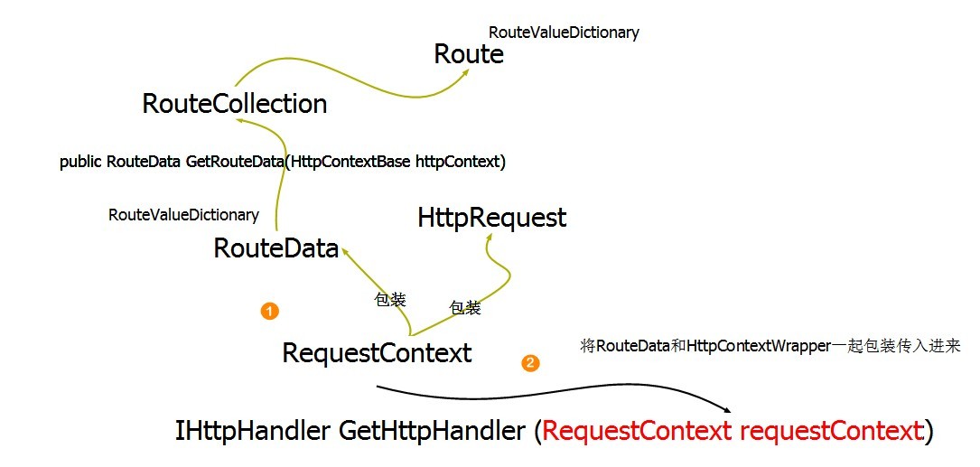RequestContext:请求上下文,将HttpRequest、RouteData包装起来传入IRouteHander接口获取IHttpHander接口;因为IRouteHandler接口方法GetHttpHandler需要知道当前请求的一些信息和根据当前Url处理后的路由数据才能计算出当前的IHttpHandler接口;