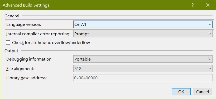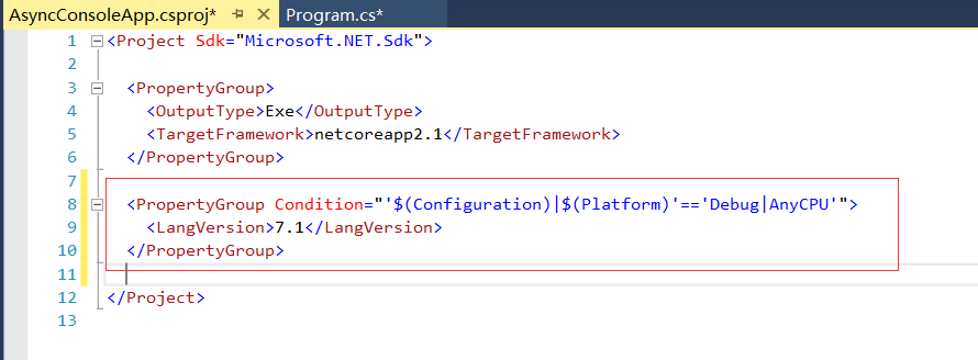 <PropertyGroup Condition="'$(Configuration)|$(Platform)'=='Debug|AnyCPU'"> <LangVersion>7.1</LangVersion> </PropertyGroup>