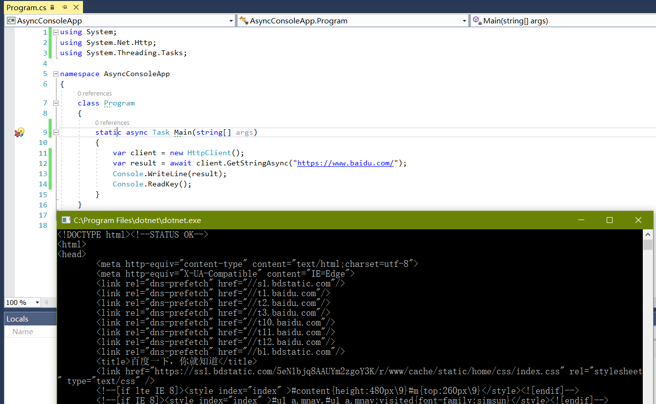 我们在Main方法中,加入如下代码,获取百度首页的html: