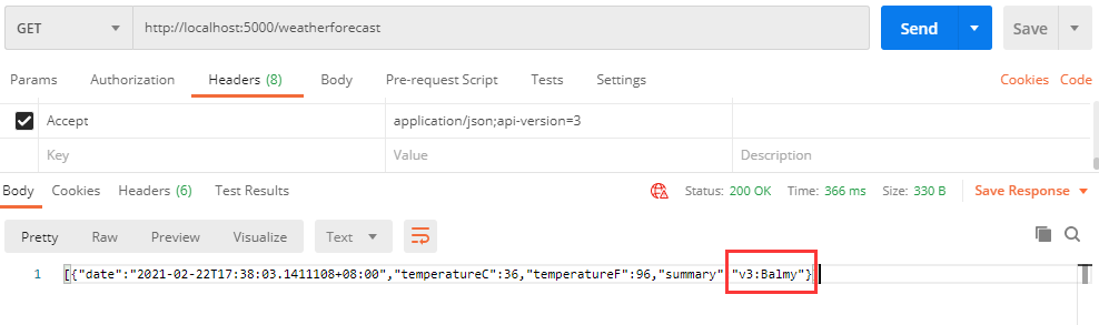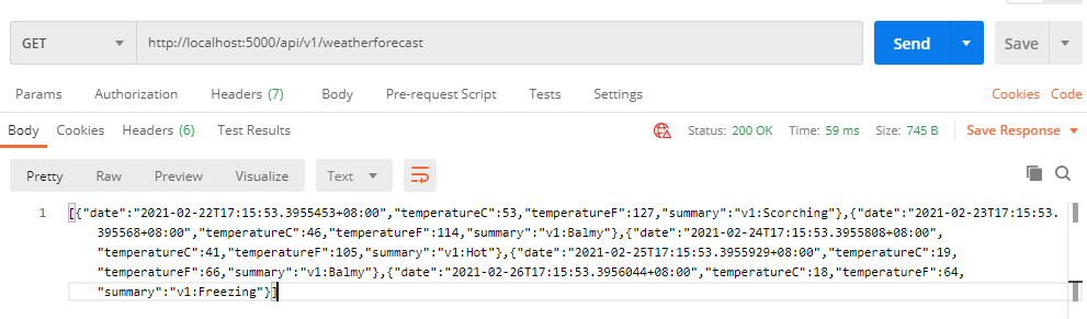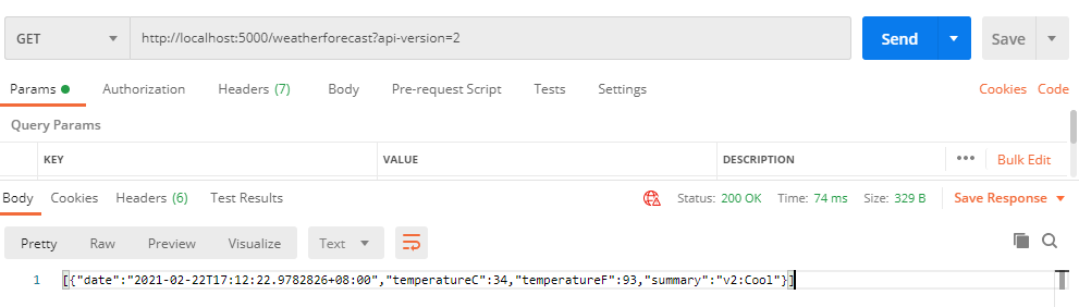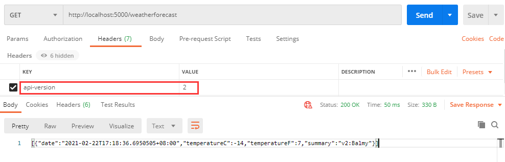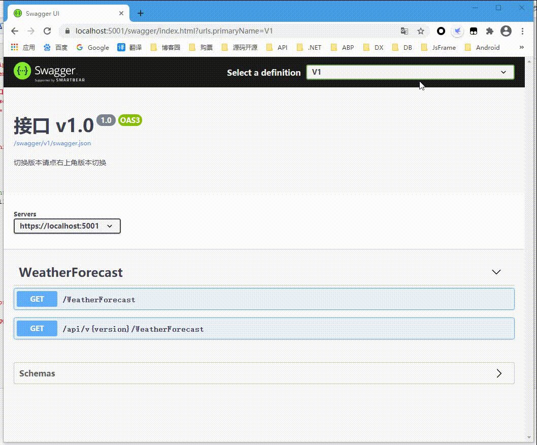 调用方式:通过调用路径传入版本号,如:http://localhost:5000/api/v1/weatherforecast