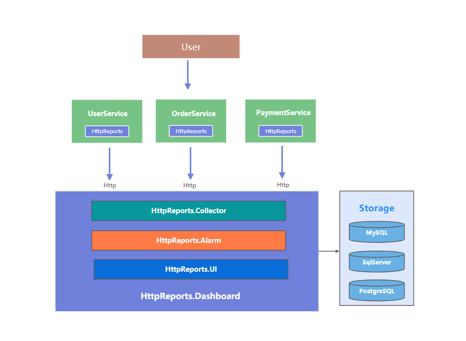 用户访问了我们的三个程序,每个程序都安装了HttpReports,它负责采集一些程序的数据和指标,然后通过Http的方式发送到Collector,简单处理后,会录入到不同的数据库中,同时,HttpReports.UI 负责把这些数据多维度的展示出来。