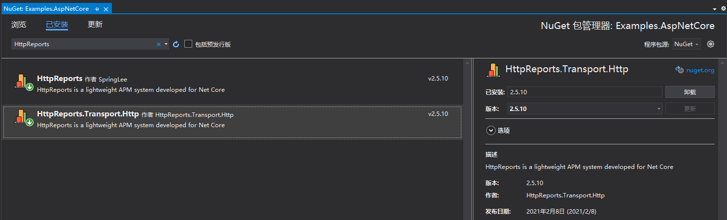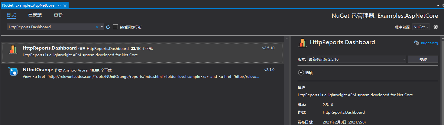 新建完成后,通过Nuget包分别安装 HttpReports.Dashboard ,HttpReports.MySQL(或者是HttpReports.SqlServer, HttpReports.PostgreSQL)。