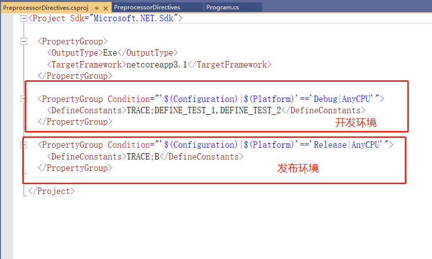 定义生效后,通过csproj工程文件我们可以看到有两条PropertyGroup对应不同的Condition