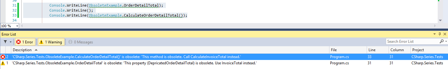 如果我们在代码中使用上述类,则会显示错误和警告。