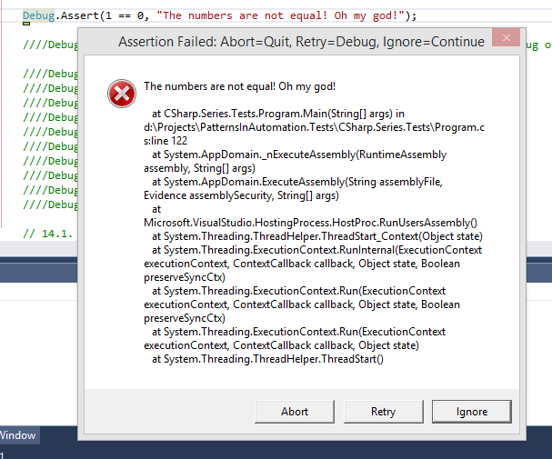 debug.assert用于检查条件,如果条件是 false,则输出消息并显示一个显示调用堆栈的消息框。
