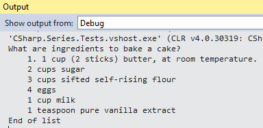 debug.writeline("what are ingredients to bake a cake?");