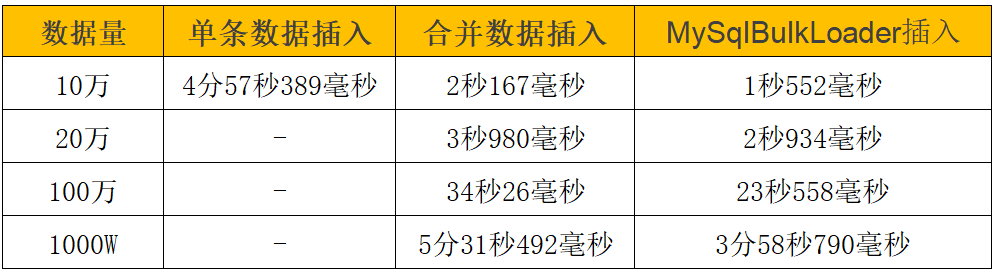 通过测试数据看,随着数据量的增大,mysqlbulkloader的方式表现依旧良好,其他方式性能下降比较明显。mysqlbulkloader的方式完全可以满足我们的需求。