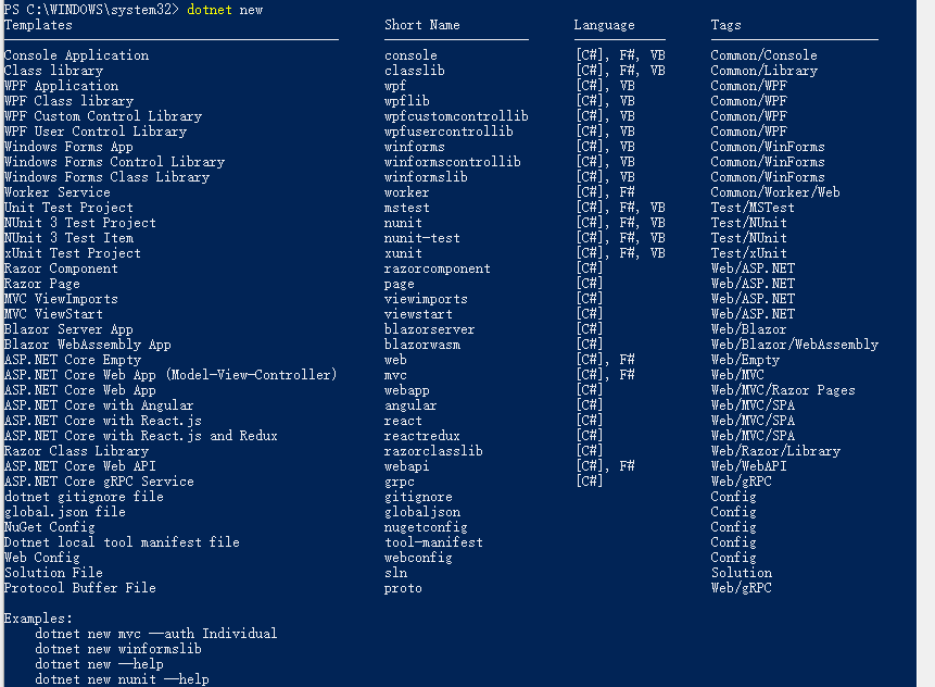 那么,我们首先看下当前dotnet 支持的项目模板: