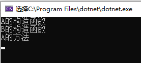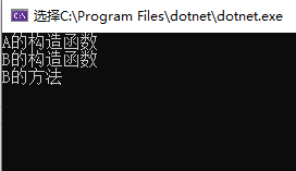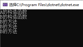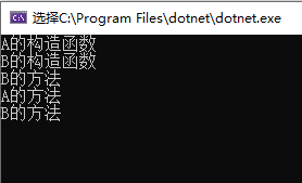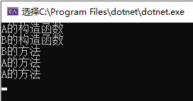 上述main方法同样是先new b对象,先执行a中的构造函数a(),然后在执行b中的构造函数b(),但是子方法中使用了override关键字“覆盖”,使得子类中方法覆盖了父类中的方法,无法再访问父类中原始方法。(要重写方法,父类方法必须有virtual关键字),所以其运行结果为: