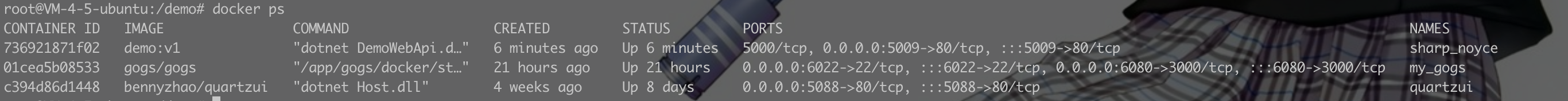 镜像生成成功后就可以通过镜像创建并运行容器了。执行 docker run --name demoapi -dp 5009:80/tcp demo:v1 命令创建并运行容器
