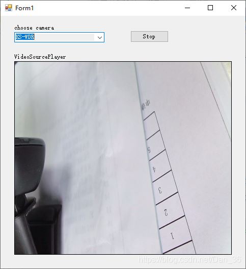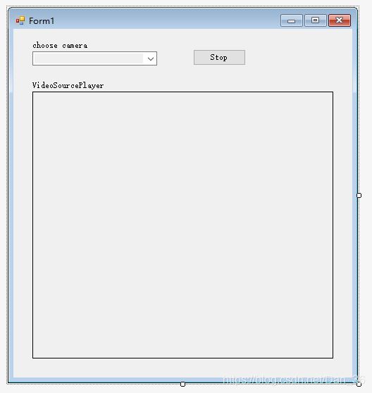 5、在窗体中放置一个videosourceplayer控件,用于显示摄像头的数据;并放置一个combobox来进行不同摄像头选择;并放置一个button用来停止显示,便于切换不同摄像头画面;