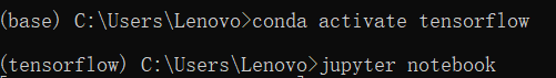 以后需要使用tensorflow的时候都需要在 anaconda prompt 中像图示这样操作,才能在jupyter中正常使用tensorflow。