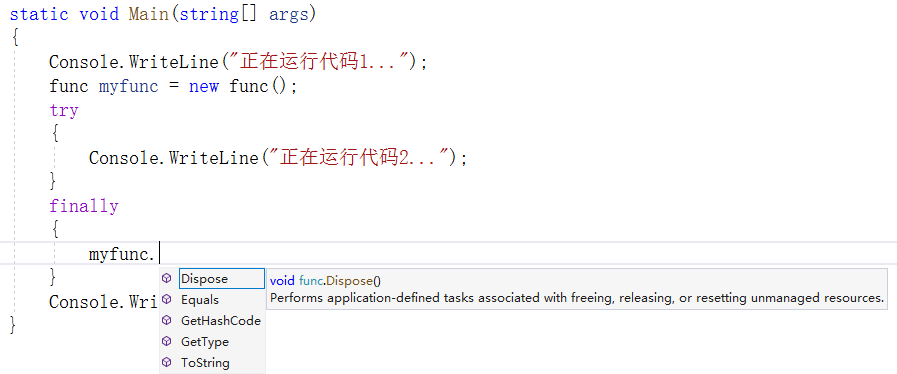 输入 对象名. 之后,会自动弹出一些提示的方法,如果有Dispose方法,那么就可以进行相应的释放。