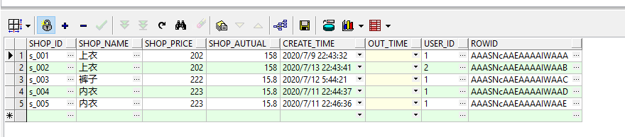 insert into T_SHOPPING c (c.shop_id,c.Shop_Name,c.shop_price,c.shop_autual,c.Create_Time,c.user_id) values(‘s_005’,‘内衣’,‘223’,‘15.8’,sysdate,‘1’);