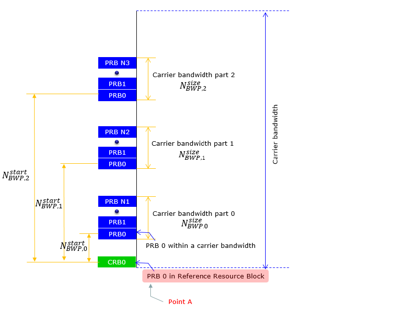 在协议中,我们定义了一个参数point A的参数,他指向了CRB起始RB为0的位置,所以,后续BWP中的所有位置都是由这个位置相对位移得来的,如下图: