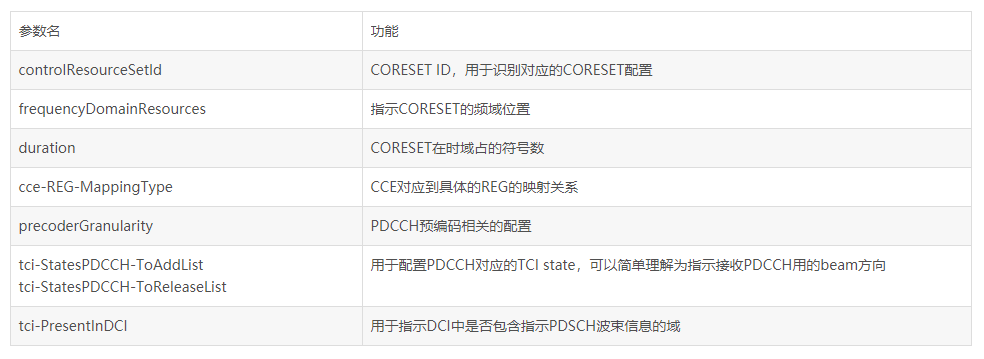 controlResourceSetId :即物理层里的’CORESET-ID’,CORESET-0即为MIB里面定义的pdcch-ConfigSIB1,或者ServingCellConfigCommon里面指定的initialDownlinkBWP。
