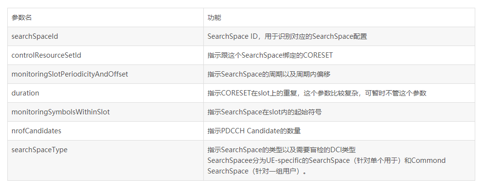 看名字就知道了,负责搜索用的。一个CORESET和一个SearchSpace绑定起来后才能确定PDCCH的配置。一个CORESET可以和多个SearchSpace绑定,但一个SearchSpace却只能和一个CORESET绑定。