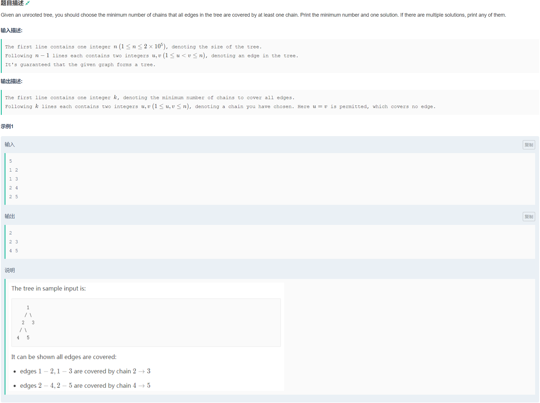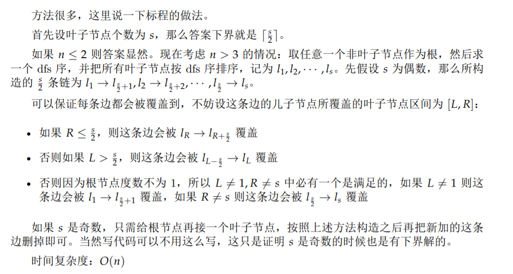 首先你从以一个度不为1的点作为根节点。然后你每次都连接一个叶子节点,这样显然是所有的边都可以被覆盖。即答案为度为1的点的个数,但是这样显然很大,可以优化,可以相当于把根节点当作中间节点,让叶子节点两两相连,显然答案已经出来了,就是但是怎么两两配对是一个问题,我比赛的时候差不多已经想到了dfs序,但是还是没写出来,下面就直接看标程吧。