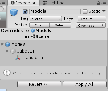当我们在预制体上做了修改后,如果想要把修改应用到asset中存储的prefab中,就需要进行应用: