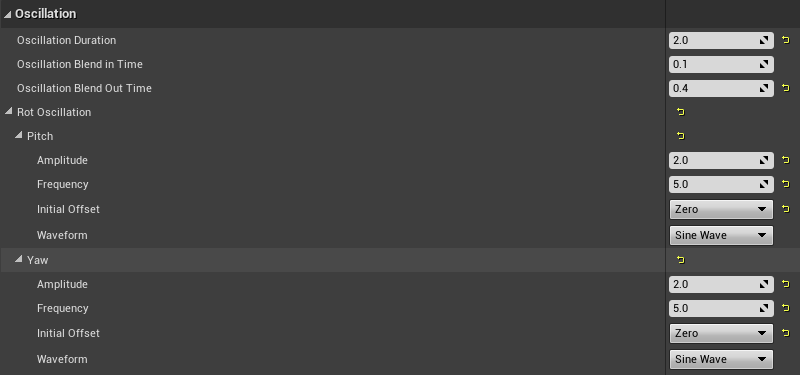 - 在 ThirdPersonBP 的 Blueprints 文件夹中创建一个 “Blueprint Class”,选择 Parent Class 为 “CameraShake”,命名为 “OnCamShake”,里边的参数设置如下,其中
