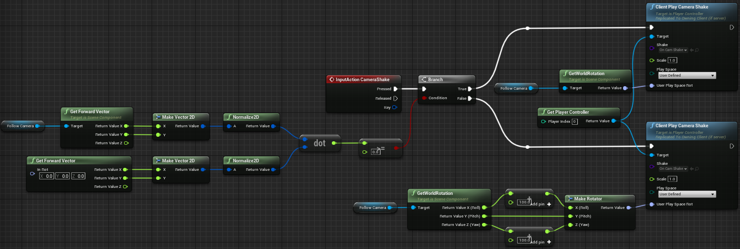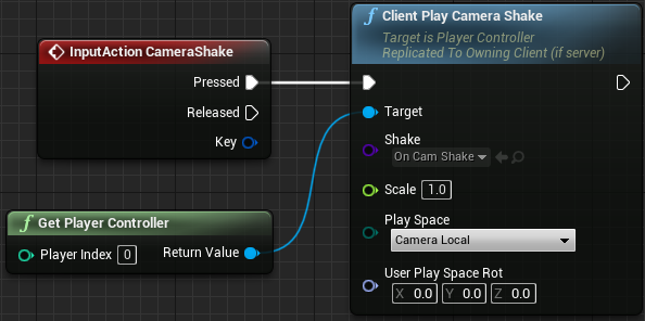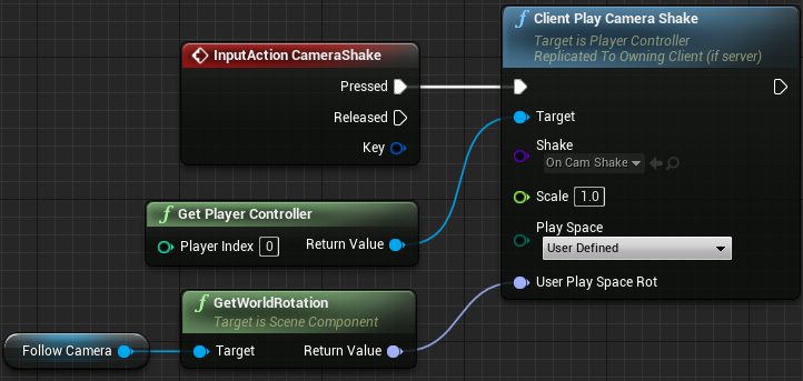 - 右键添加 “Get Player Controller”,从 Return Value 拖出 “Client Play Camera Shake”,从 “InputAction CameraShake” 的 “Pressed” 连接到 “Client Play Camera Shake”;“Shake” 中选择刚刚创建的 “OnCamShake”;
